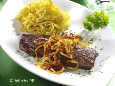 4 Die Zwiebelringe in dem heißen Bratfett schön kross braten. Rumpsteaks mit Zwiebeln und Spätzle auf Tellern anrichten und mit etwas Petersilie garnieren. Dazu schmeckt Weißkrautsalat.